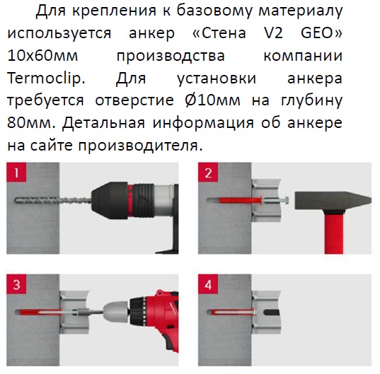 Для крепления к базовому материалу используется анкер «Стена V2 GEO» 10х60мм производства компании Termoclip. Для установки анкера требуется отверстие Ø10мм на глубину 80мм.