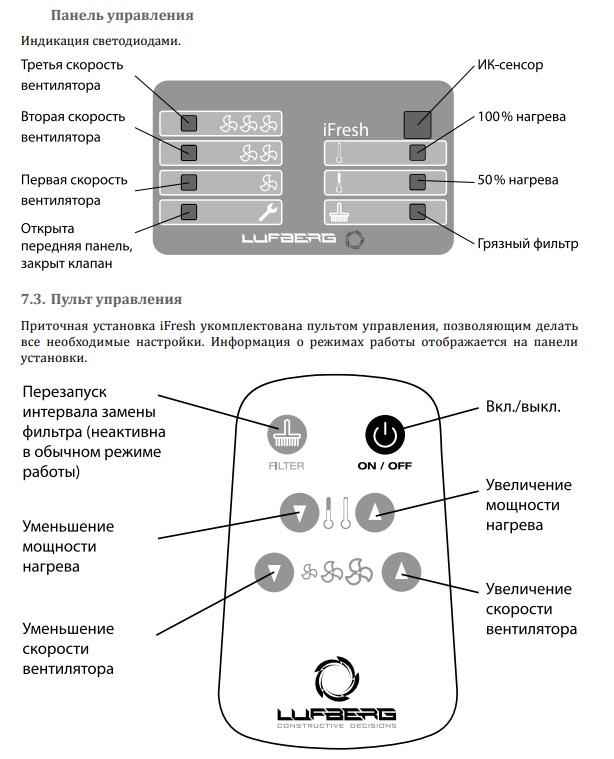 управление расходом воздуха, регулировка нагревателя, защита от перегрева, индикация о необходимости замены фильтра, аварийный сигнал об открытия панели установки, пульт ИК дистанционного управления в комплекте.