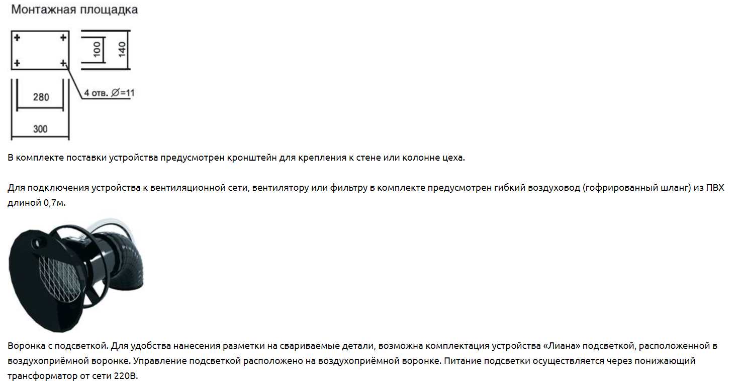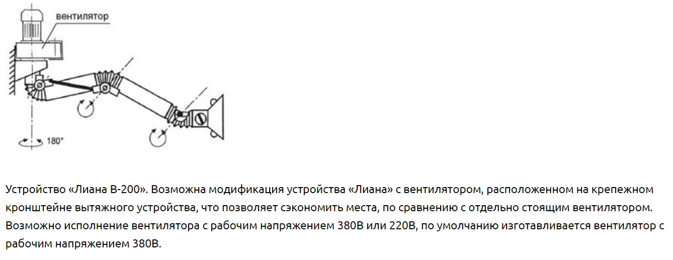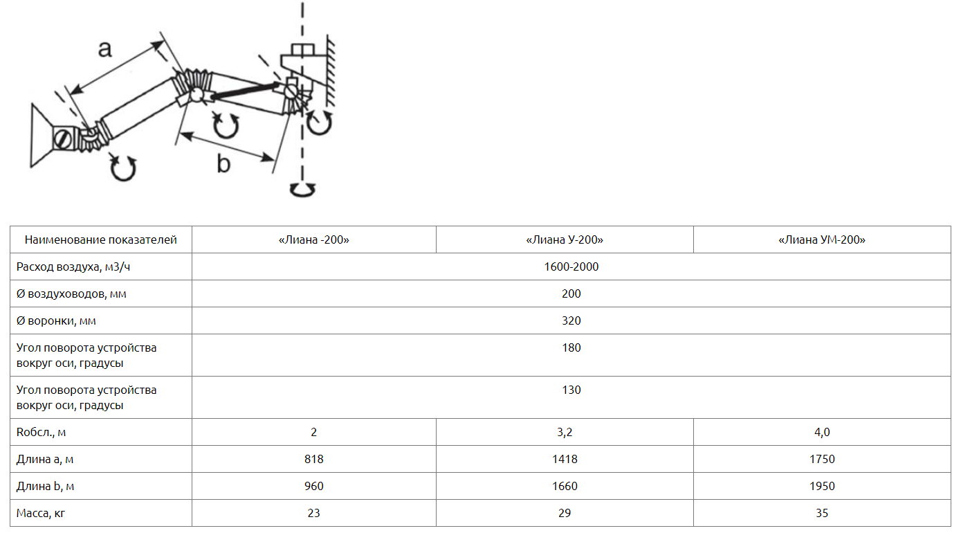 Выпускаемые устройства диаметром воздуховодов 200мм и воронкой диаметром 320мм рассчитаны на расход воздуха 1600-2000 м3/ч. Устройства «Лиана-200» может быть радиусом обслуживания 2м (без индекса), 3,2м (с индексом «У»), 4м (с индексом «УМ»). В конструкции устройства предусмотрен кронштейн для крепления к стене или колонне цеха. Рекомендуемая высота установки устройства 2-2,25м. Устройство верхнего подключения (под опорой). Для подключения устройства к вентиляционной сети, вентилятору или фильтру в комплекте предусмотрен гибкий воздуховод (гофрированный шланг) длиной 0,7м.