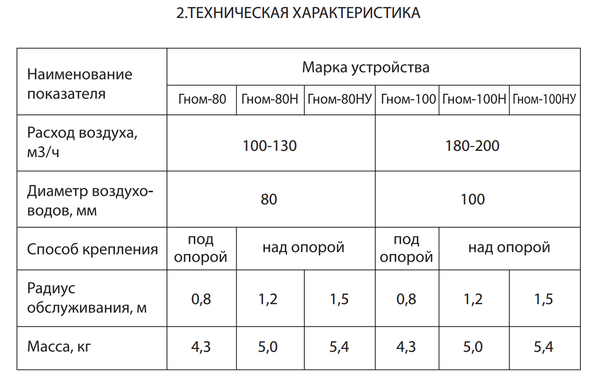 Выпускаемые устройства диаметром воздуховодов 100мм диаметром воронки 150мм рассчитаны на расход воздуха 150-200 м3/ч. Устройства «Гном-100У» радиусом обслуживания до 1,5м. В конструкции устройства предусмотрен кронштейн для крепления к стене или колонне цеха, металоконструкциям. Рекомендуемая высота установки устройства 40-50см над рабочей поверхностью. Устройство верхнего подключения (под опорой). Для подключения устройства к вентиляционной сети, вентилятору или фильтру в комплекте предусмотрен гибкий воздуховод (гофрированный шланг) диаметром 110мм, длиной 0,5м.